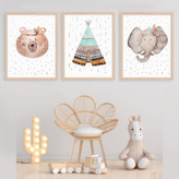 تابلو دکوراتیو اتاق کودک طرح خرس کوهستان فیل و چادر سرخپوستی مجموعه 3 عددی