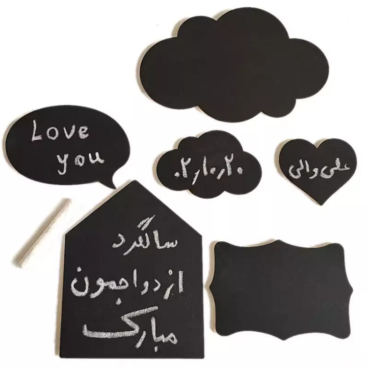مجموعه 6 عددی تخته سیاه طرح خانه، ابر کوچک و بزرگ و قلب و کامنت و مستطیل دالبردار ، مناسب یادداشت های روزانه ، حرفهای زیبا و لیست خرید و .. میباشد. شما میتوانید هر کدام را در گوشه کناری از خانه بگذارید و از آن برای یاداوری کارها یا جملات زیبا استفاده کنید. این مجموعه به همراه یک گچ ارسال میشود. ابعاد ابر بزرگ : 20x13 سانتی متر ، خانه : 13x17 سانتی متر ، مستطیل دالبردار: 10x13 سانتی متر، طرح کامنت : 10x12 سانتی متر، ابر کوچک : 10x7 سانتی متر، قلب :7x8 سانتی متر میباشد. این مجموعه درکنار هم حدود 30x30 سانتی متر میباشد.