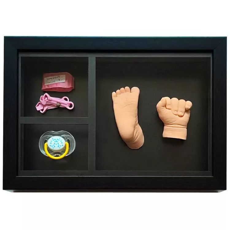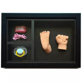 بعد از ساخت تندیس دست و پای کودکتان با مجموعه قالب گیری نی نی تندیس موجود در با سلام، وقت آن است که این یادگاری ارزشمند را قاب بگیرید. این محصول ، قاب باکس دار مخصوص تندیس دست وپای نوزاد و کودک و دیگر یادگاری های نوزادی مانند عکس کودک ، دستبند بیمارستان ، بندناف نوزاد ، پستانک ، مو و ناخن نوزاد میباشد. حتی میتوانید بجای تندیس، پاپوش نوزادی یا پیشبند یا کلاه و دستکش و جوراب نوزادی را در قاب بگذارید.روی قاب شیشه دارد که از خاک گرفتن وسایل جلوگیری میکند. پشت قاب چند عدد پین مشکی وجود دارد که به راحتی با صاف کردن پین ها میتوانید قاب را باز کنید و یادگاری های نوزادی دلبندتان را در آن بچسبانید تا برای همیشه ماندگار شود. قاب دارای آویز میباشد و میتوانید آن را به دیوار آویز کنید و از یادگاری های کودکی فرزندتان لذت ببرید.