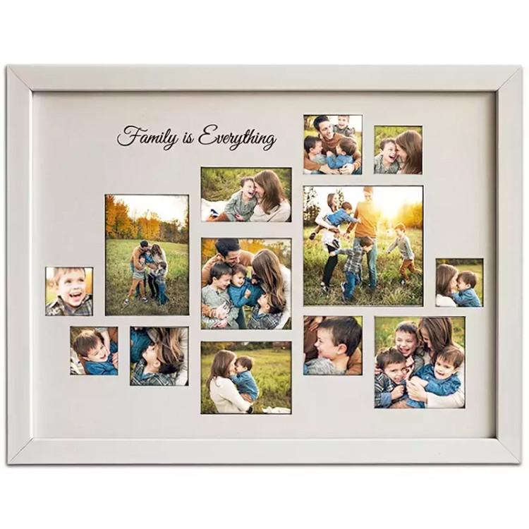 قاب عکس چند عکسی یا پازلی 13 عکس Family is Everything از بهترین جنس پی وی سی قاب عکس و ام دی اف سفید شبکه ای ساخته شده است. متن Family is Everything روی ام دی اف حک شده و به معنی خانواده همه چیز است میباشد. سایز این قاب 30 در 40 سانت و دارای 13 عکس با سایزهای مختلف میباشد. با استفاده از این قاب میتوانید خاطرات زیبایتان را در یک نگاه ببینید.و در یک فضای کوچک تعداد زیادی عکس داشته باشید. در پشت قاب چند عدد پین مشکی وجود دارد که با صاف کردن آنها با دست قاب به آسانی باز میشود و عکسها را پشت ام دی اف شبکه ای با چسب کاغذی یا آبی میچسبانید. این قاب مناسب عکسهای خانواده ، دوستانه و کودکان میباشد و جلوه ی زیبایی به منزلتان میبخشد. قاب دارای آویز دیواری میباشد.