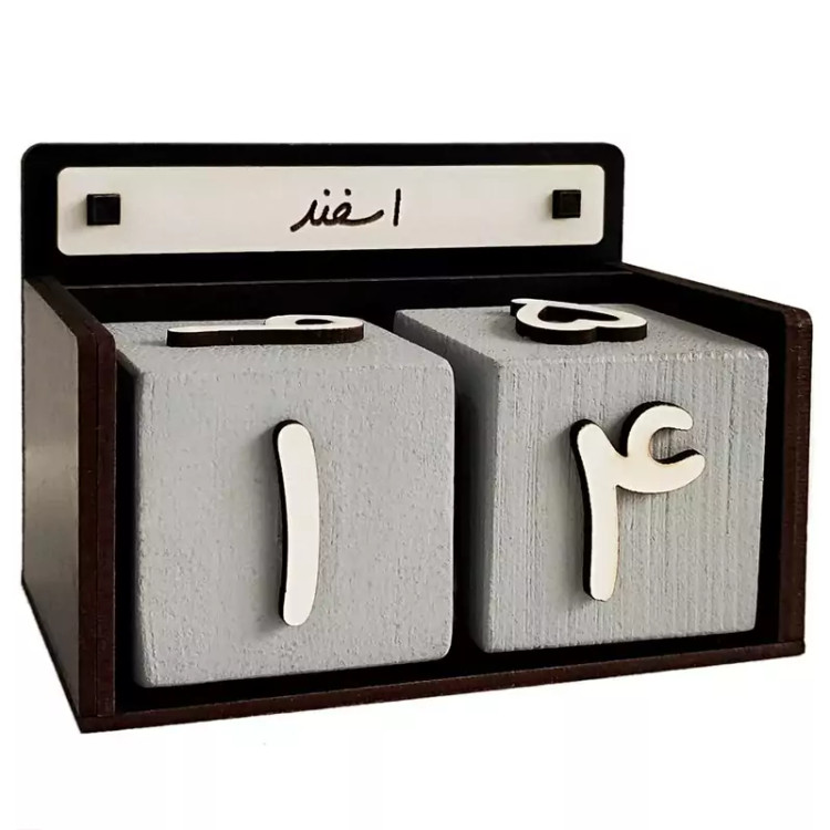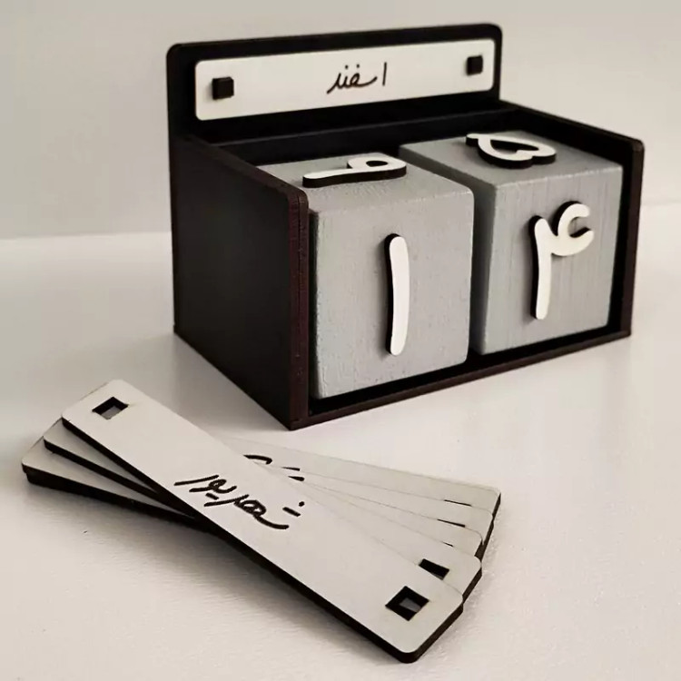 تقویم رومیزی با ابعاد مناسب علاوه بر کارایی می تواند زیبایی دوچندان به میزکار، میز مطالعه و یا میز کوچک خانه شما بدهد. تقویم رومیزی مدل مکعب یک هدیه مناسب برای هر قشری به شمار می آید و به لحاظ اینکه از چوب طبیعی ساخته شده است، احساس دلنشین طبیعت را به محلی که در آن قرار می گیرد، می دهد. طراحی تقویم به گونه ای است که به صورت مادام العمر می توان از آن استفاده کرد و جای همیشگی خود را در منزل، محل کار حفظ کند.مکعب های این تقویم از چوب روس ساخته شده و دارای نمایشگر نام ماه شمسی و عدد برجسته روزهای ماه می باشد.یک محفظه داخل استند برای نشانگر های ماه های مختلف تعبیه شده است.بدنه و نشانگر از جنس ام دی اف مرغوب میباشد. این تقویم دارای یک بدنه به ابعاد 12x8.5x8 سانتی متر و 2 مکعب مربع جهت اعداد 1 تا 31 روز هر ماه و 12 نشانگر جهت نام 12 ماه سال میباشد.