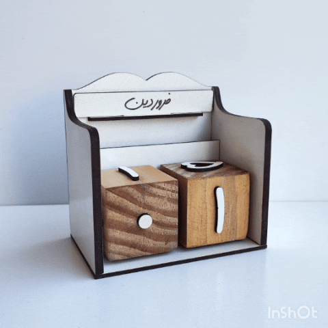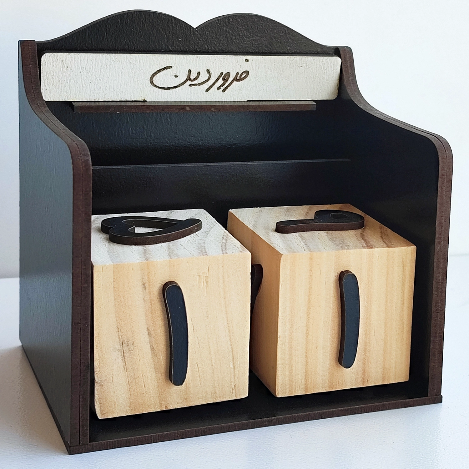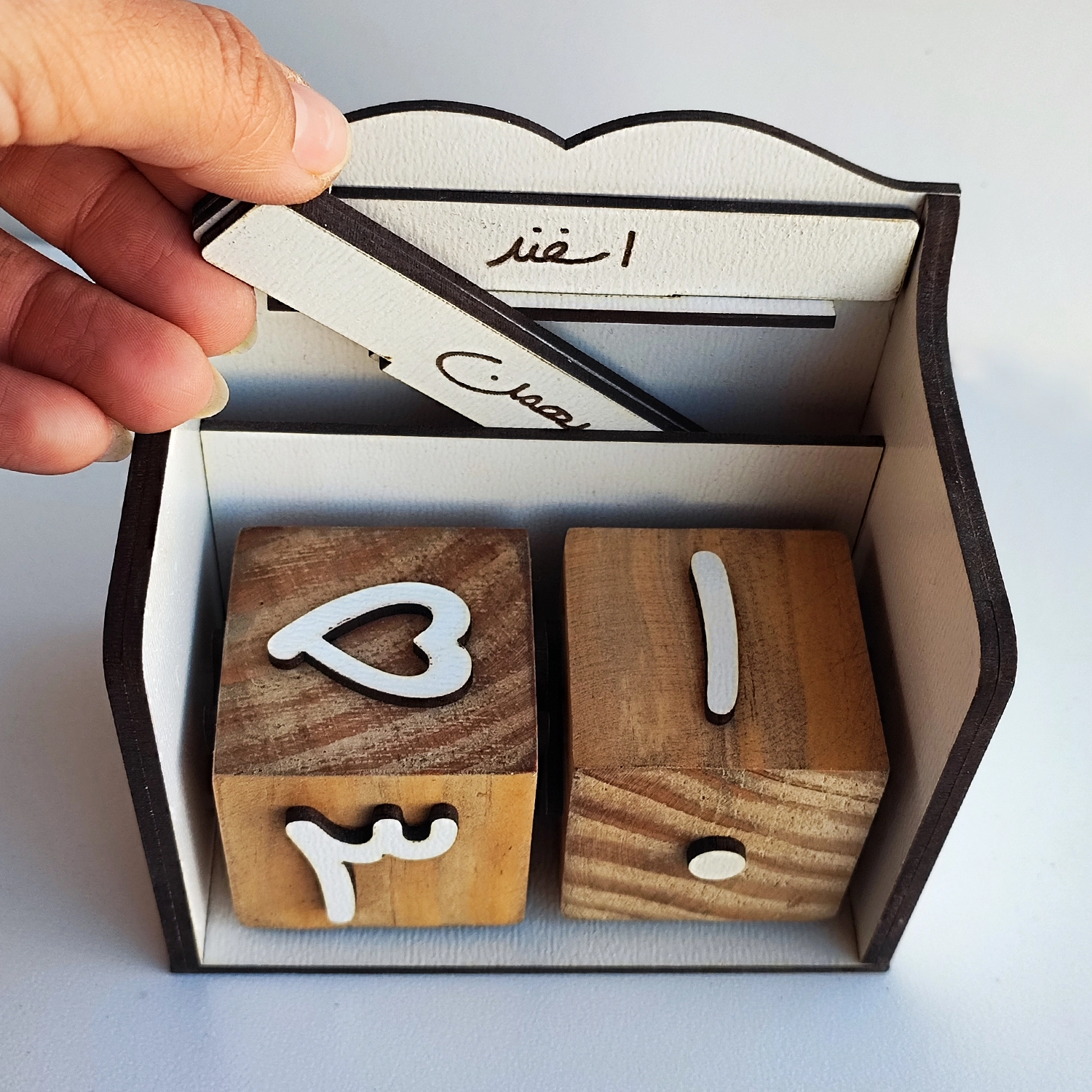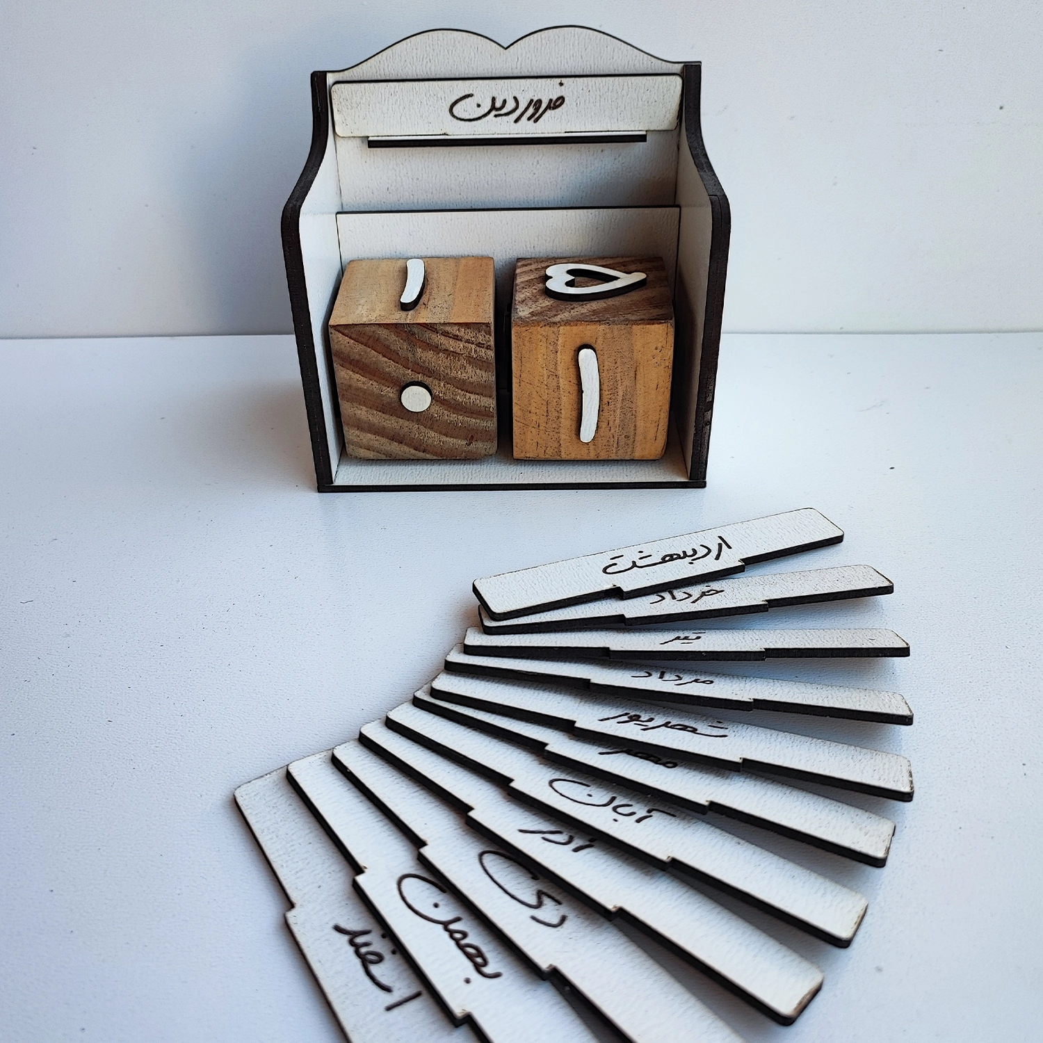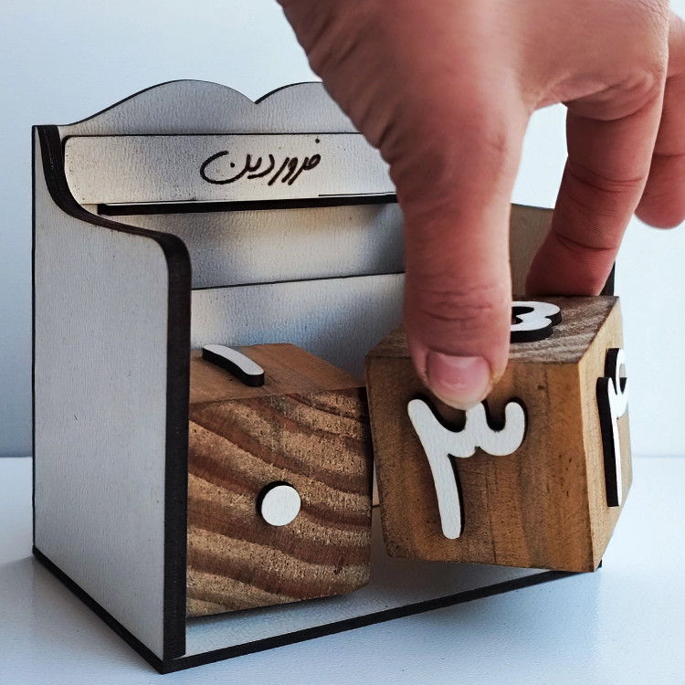 تقویم چوبی جاودانه نی نی تندیس ، شامل دو مکعب اعداد که از 1 تا 31 هر ماه را با چرخاندن مکعب ها داراست.