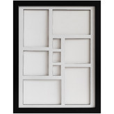 قاب عکس چند عکسی یا پازلی 9 عکس از بهترین جنس پی وی سی قاب عکس مشکی و ام دی اف سفید شبکه ای ساخته شده است. این قاب دارای 4 جای عکس 10x15 سانت ، 2 جای عکس 10x10 و 3 جای عکس 3x4 میباشد. با استفاده از این قاب میتوانید خاطرات زیبایتان را در یک نگاه ببینید. در پشت قاب چند عدد پین مشکی وجود دارد که با صاف کردن آنها با دست قاب به آسانی باز میشود و عکسها را پشت ام دی اف شبکه ای با چسب کاغذی یا آبی میچسبانید. این قاب مناسب عکسهای خانواده ، دوستانه و کودکان میباشد و جلوه ی زیبایی به منزلتان میبخشد. قاب دارای آویز دیواری میباشد.